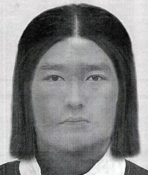 vermutlich männlich, 30 bis 35 Jahre alt, 1,80 bis 1,85 m groß, nordamerikanisch-indigenes oder asiatisches Erscheinungsbild mit sehr feinen Gesichtszügen, schwarzes, glattes, mittellanges Haar;