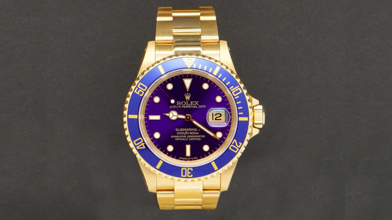 „Rolex Submariner Purple Dial“ mit Datumsanzeige, lilafarbenem Ziffernblatt und Lünette (ursprünglich blau, nachträglich verfärbt), goldenes Armband; Wert: rund 25.000 Euro.