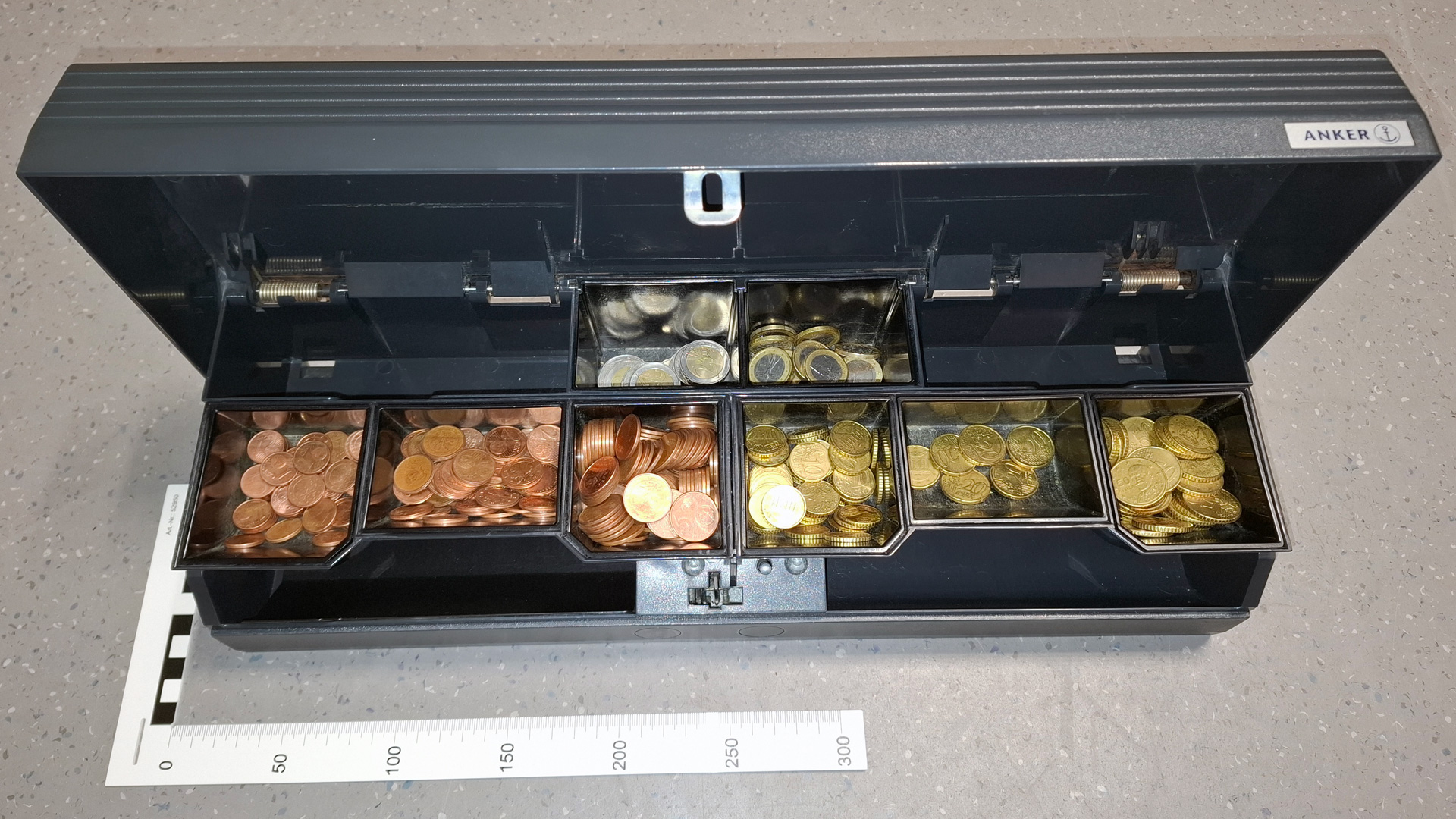 In dem Einkaufsbeutel verstaute der Täter seine Beute: das Geld sowie eine schwarze Kassenlade der Marke „Anker“, 45 mal 10 mal 15 cm groß.